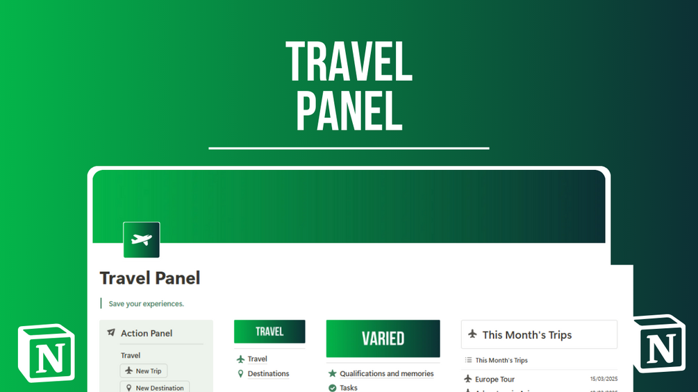 Our Travel Dashboard Template in Notion is designed to help you plan every detail of your adventures, from destinations and tasks to unforgettable memories. Ideal for passionate travelers who want to keep a complete record of their experiences.