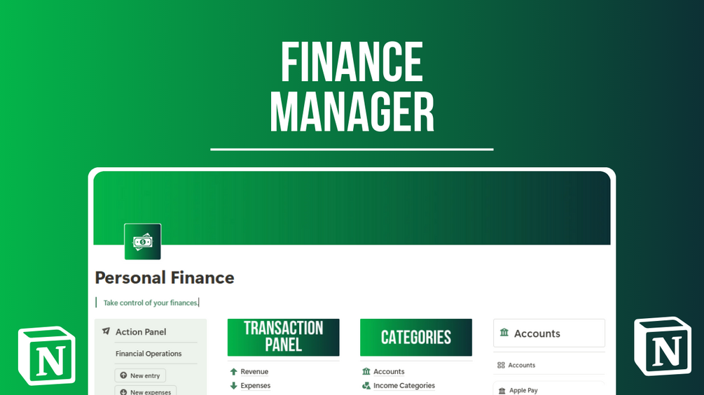 Nuestra Plantilla de Finanzas Personales en Notion te ayudará a organizar y gestionar tu dinero de manera clara y estructurada. Con secciones diseñadas para monitorear ingresos, gastos, presupuestos y cuentas, tendrás el control total de tus finanzas en un solo lugar.